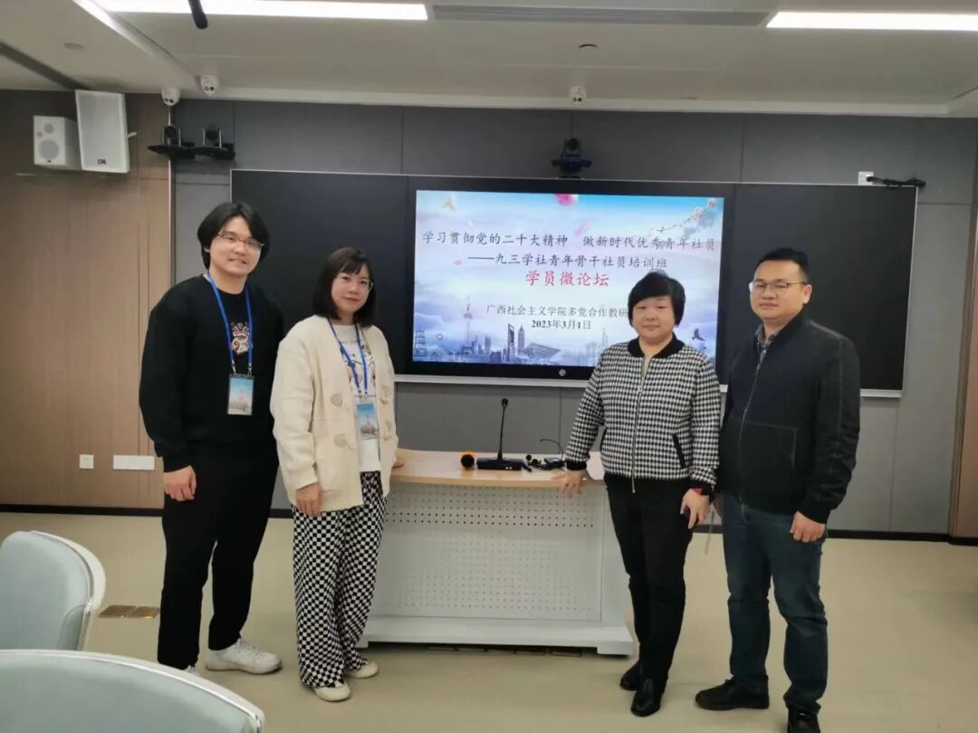 近日,九三学社广西区委青年骨干社员培训班圆满结束,我市社员陶月华、吴思畅、刘林好、李彦熙参加了本次培训,社区委为本次培训提供了丰富多彩的教学内容,从习近平新时代中国特色社会主义思想,到中共二十大精神,再到中央统战工作会议精神,统一战线理论与政策,中国共产党领导的多党合作和政治协商制度,九三学社社史等,全方位提升了青年骨干社员履职能力。本次培训中,我市社员积极参与各项活动,展现了我市青年骨干社员的活力与风采。