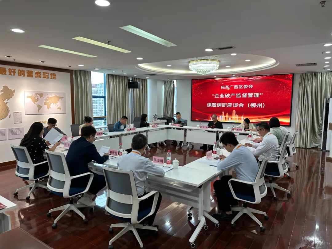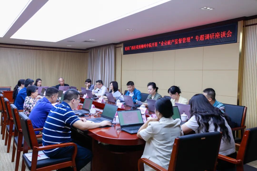 为助力提升自治区营商环境,8月30日,自治区人大外事华侨委副主任、民革广西区委会副主委梁崎峰率调研组一行,就“企业破产监督管理”专题到柳州开展调研。民革广西区委会常委、柳州市政协副主席、民革柳州市委会主委付建文陪同调研。柳州市中级人民法院党组书记、院长曾艳,党组成员、副院长闭文军等领导参加了座谈交流会。