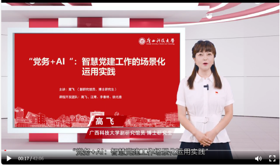 近日,由民盟广西科技大学支部副主委高飞主讲的课程《“党务+AI”:智慧党建工作的场景化运用实践》被自治区党委组织部正式确定为2025年度全区网络培训必修课程,标志着该课程在智慧党建领域的创新性与实用性获得高度认可。