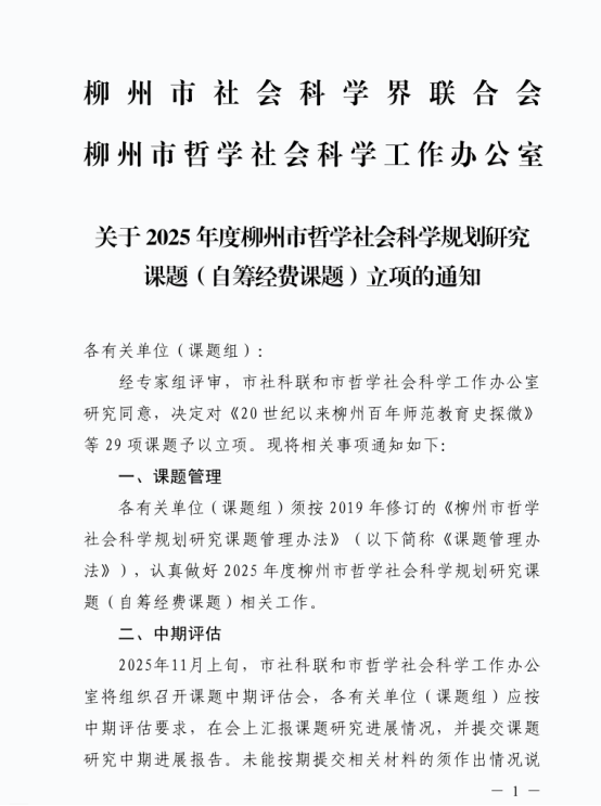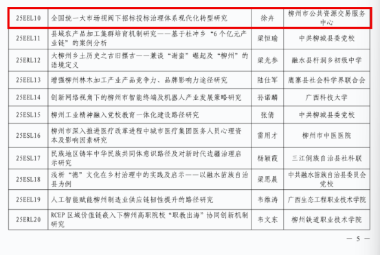 近期,柳州市社会科学界联合会柳州市哲学社会科学工作办公室公布了2025年度柳州市哲学社会科学规划研究课题,共有29项课题予以立项。柳州市公共资源交易服务中心副主任、民盟政研支部盟员徐卉主持的《全国统一大市场视阀下招标投标治理体系现代化转型研究》课题(编号:25EEL10),凭借其扎实的实证基础与前瞻性的政策视野,获准立项。