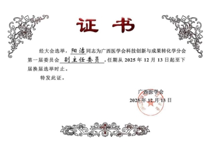 2025年12月13日,第一届广西医学会科技创新与成果转化学分会成立大会在广西南宁举行。经过全体委员投票表决,柳州市工人医院科研科主任、民盟柳州市工人医院支部主委阳洁当选为首届副主任委员。