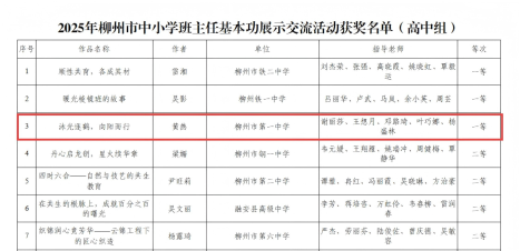 近日,柳州市教育局组织开展了2025年柳州市中小学班主任基本功展示交流活动。经专家评审、公示等环节,共评选出46件获奖作品,其中,民盟柳州市第一中学支部主委黄燕凭借作品《沐光逐鹤,向阳而行》荣获一等奖。