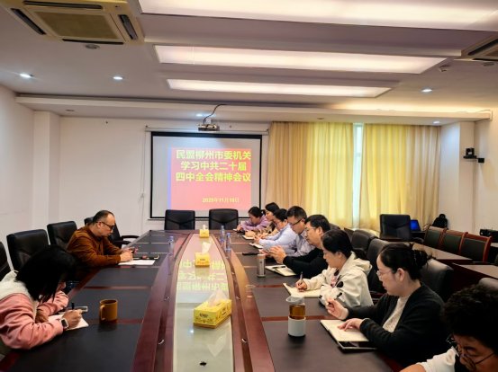 11月10日,民盟柳州市委召开机关干部会议,传达学习中共二十届四中全会精神,民盟柳州市委专职副主委杨钢主持会议并讲话,全体机关干部参加会议。