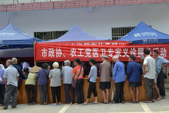 市政协委员、农工党员、市工人医院博士袁天柱(左一)为群众义诊
