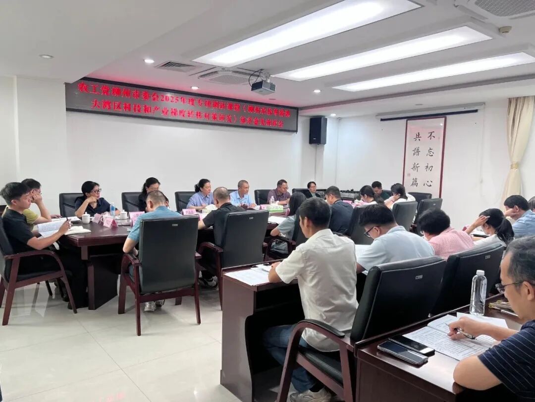 10月14日,农工党柳州市委会2025年度专项调研课题《柳州承接粤港澳大湾区科技和产业梯度转移对策研究》征求意见座谈会在机关大会议室举行,柳州市人民政府副市长、农工党柳州市委会主委、市统计局局长胡兰出席座谈会并讲话。座谈会由市委会专职副主委李琪主持,副主委李晶晶、蒋旭东,市委会常委邬佩云、李艳玲及课题组相关成员参加座谈会。市发展和改革委员会等有关单位代表,上汽通用五菱等相关企业代表,部分党员代表参加座谈会并提出意见建议。