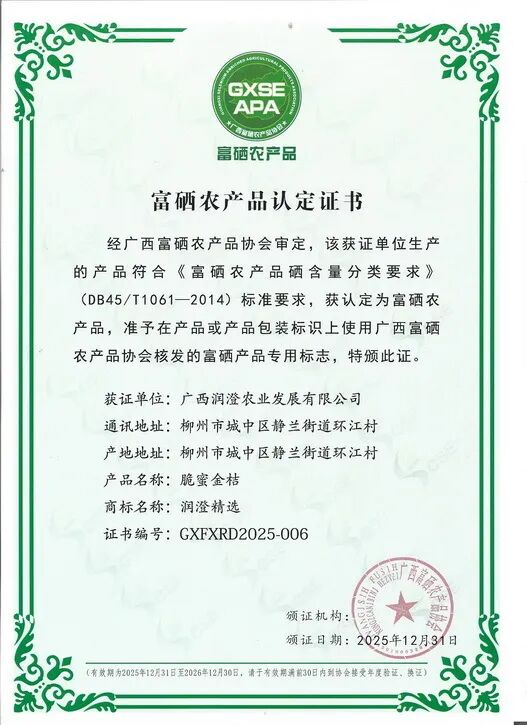 近日,经广西富硒农产品协会审定,柳州市城中区广西润澄农业发展有限公司种植的脆蜜金桔获得 “富硒农产品”认证,为柳州特色水果富硒标准化生产提供了示范样板基地。