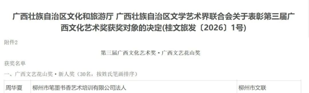另,根据最新公布的《自治区文化和旅游厅、自治区文联关于表彰第三届广西文化艺术奖*获奖对象的决定》,周华夏荣获广西文艺花山奖·新人奖。