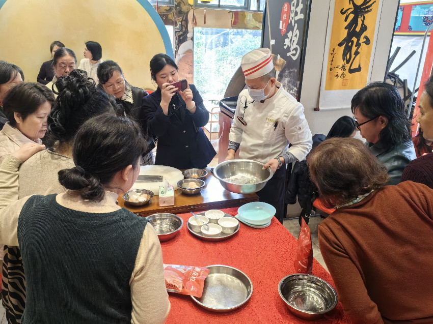 本次活动得到了致公党党员、柳州金记猪肚鸡饭店总经理吴孟学的大力支持。专业面点师现场展示菜品“鸿运荔枝球”的制作,党员们饶有兴致地学习、观摩和尝试操作,逐步掌握选料、剁馅、调味、捏丸等制作步骤,气氛祥和热闹。