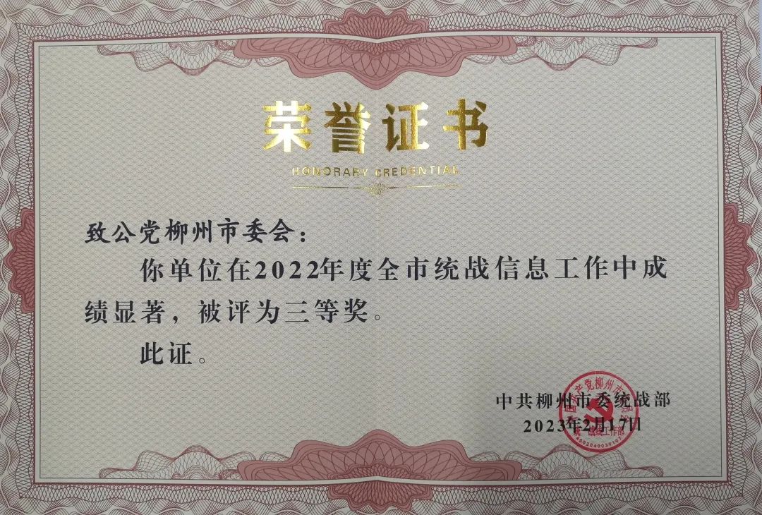 近日,中共柳州市委统战部对2022年全市统战系统信息工作先进进行了表彰,致公党柳州市委会获评2022年度全市统战信息工作三等奖,致公党党员许丹撰写的《扎实推进柳州高校党外知识分子建言献策实践研究》获2022年度全市统战理论政策研究创新成果二等奖。