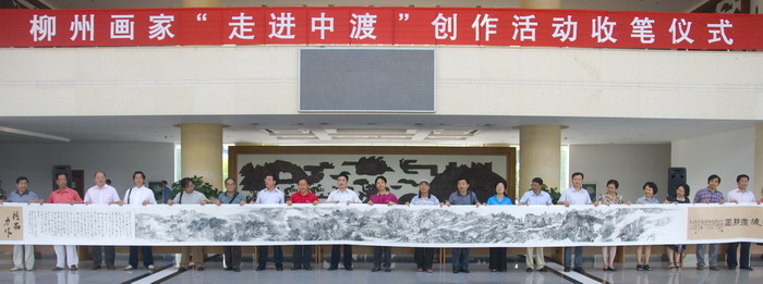 仪式上,画家们在长16米、宽70厘米的“中渡揽胜图”长卷落款盖章,标志着创作活动圆满完成,并和市政协委员、柳州市蓝海科技公司董事长阳立云一起将长卷赠送给鹿寨县,市政协和鹿寨县领导还向画家们颁发了收藏证书。