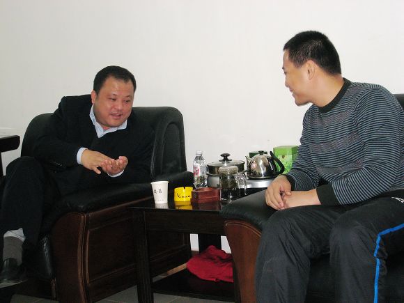 (图四:3月9日上午,区政协副主席宋筑峰(左一)来到市源山物业管理有限责任公司,向该公司总经理孟祥滨了解企业的基本情况和发展过程中遇到的困难和问题。 李启权/摄)