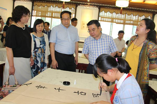 当天,考察团首先来到文昌小学参观考察,详细了解学校书法特色教育开展情况。随后,在县总工会和县文化馆,考察团一行参观了书画展厅,并听取了我县书画文化发展情况介绍。据了解,柳城县书协有会员80多人,其中国家级会员4名、省级会员7名、市级会员29名;美协有会员28人,其中省级会员3人、市级会员12人。2010年,该县成立“兰亭书苑”,同时社会上的书法组织如雨后春笋,层出不穷,同时各类书法兴趣小组在柳城文昌小学、实验小学、民族中学等学校成立并将书法教学常态化。2012年,柳城大埔一小被命名为中国书法家协会“兰亭小学”,是目前广西第一所也是唯一一所中国书法家协会兰亭小学。2015年,柳城县成立职工书法协会、职工书法室、书画展厅。此外,柳城县通过“走出去”和“请进来”开展书画交流活动,部分柳城籍书画骨干纷纷到北京荣宝斋等高等艺术机构跟随名家学习,并通过创建文艺志愿者服务站、开设文艺讲堂等方式,开展经常性的书法培训、展览、交流、创作、研讨等活动,营造出全民学书法、爱书法、赏书法的浓厚氛围,打响了“书香柳城”、“翰墨柳城”品牌。2016年,柳城县成功创建“广西书法之乡”。