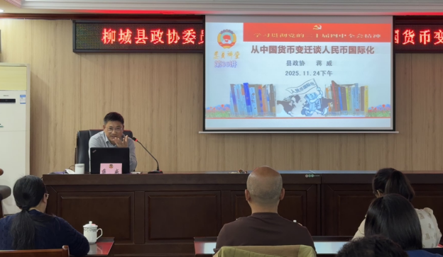 11月24日,在柳城县政协四楼常委会议室里,政协委员讲堂第三十六讲如期开讲。本次讲堂以“从中国货币变迁谈人民币国际化”为主题,由县政协主席蒋威担任主讲人,县政协副主席莫春昭、兰海波、黄柏泉,秘书长宁靖,以及政协机关干部职工、部分政协委员参加。