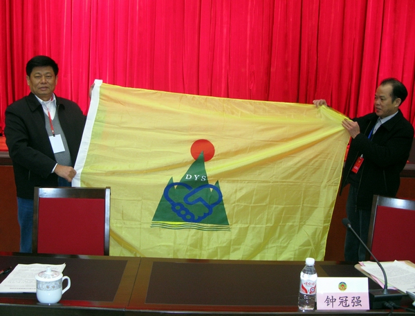 柳江县政协主席钟冠强与藤县政协副主席霍煜梧交接会旗,第23次会议将于明年在藤县举行。