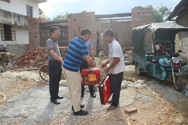 谭海托主席来到位于洛满镇露南屯的周雄光家里,详细了解该户家庭生产生活情况,并查看了该户农村危房改造进展情况,看到其危房改造已经建好第一层楼房主体框架,谭海托希望该户充分利用好政府危房改造资金,妥善安排好生产生活,争取从脱贫到奔小康目标迈进。由于该户还是政协联络员孔祥运结对扶贫助学“结对户”,周雄光之子周小吉目前就读吉林大学大三,孔祥运已连续资助其两个学期生活费共计8000元,孔祥运希望周雄光做好周小吉思想工作,在学校安心学习,生活上不要有太多顾虑,作为政协联络员会尽力帮助周小吉摆脱困境。慰问组一行还带去了油和月饼,让该贫困户能够过上一个祥和、欢乐的节日。