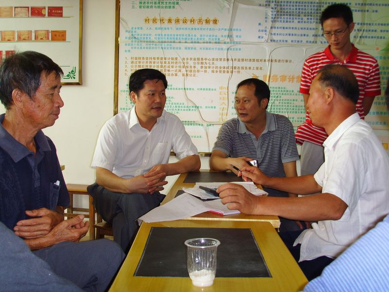 图二:县政协主席郑一鸣(左二)在寨沙镇龙江村民委指导选举工作。
