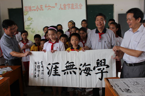 最后,袁子强主席还现场挥毫泼墨,题词赠与四排乡二小全体师生。