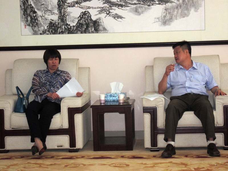 图二:我县饶冬生副主席(右)和金秀县政协副主席肖龙玉(左)在讨论协作会事项。