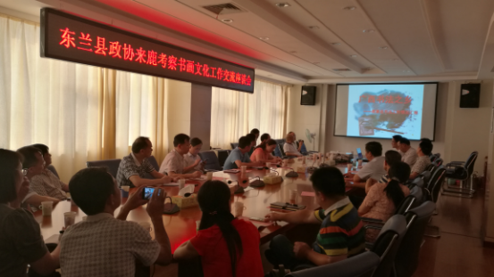 2017年5月16日下午,东兰县政协主席覃剑、副主席韦名邕、黄云率政协委员一行20多人,来到我县考察书画文化工作情况,我县政协主席袁子强、副主席韦宣隆、蒙广远、谭梅,以及文教卫体卫委主任李维仁陪同下,进行实地考察和座谈交流。