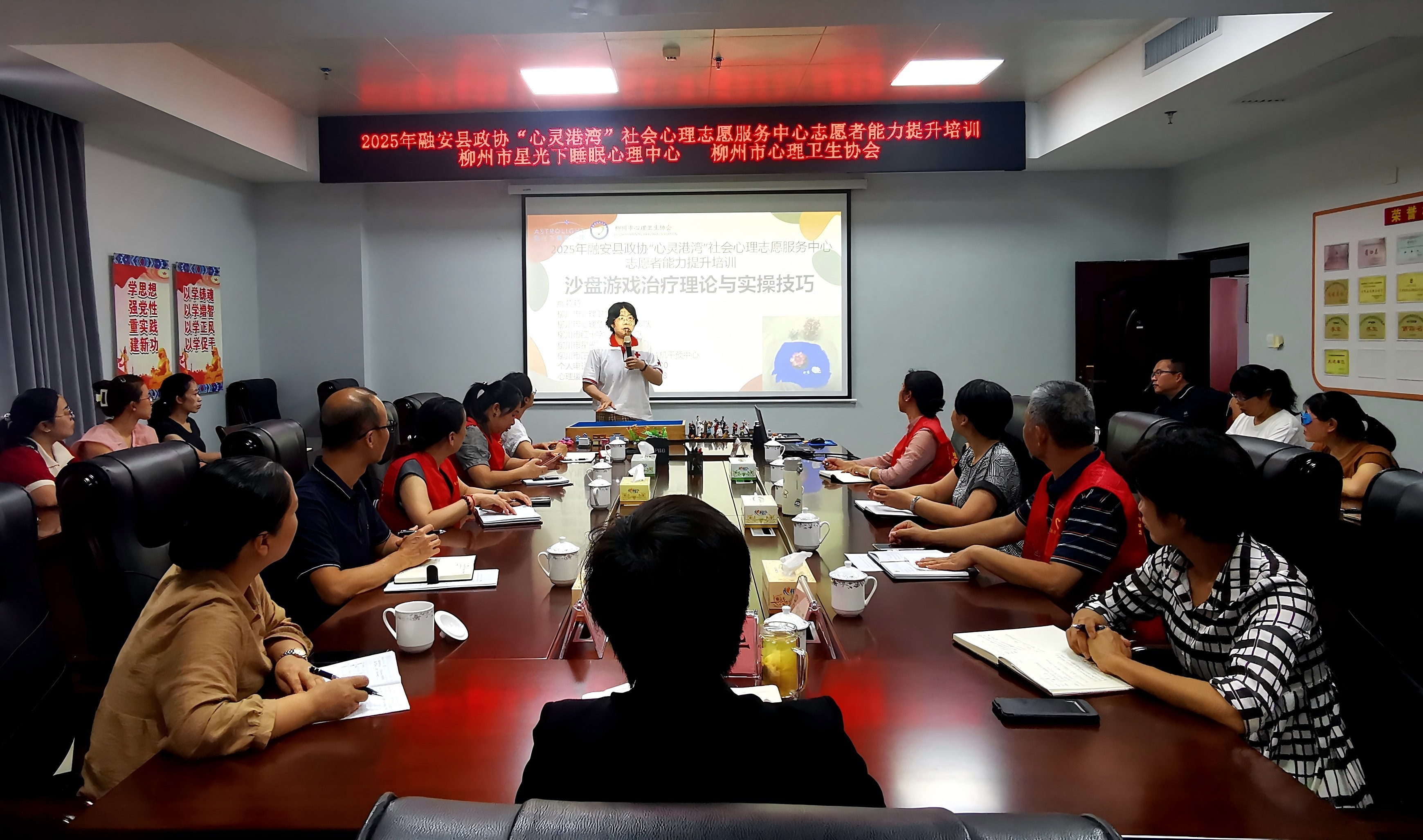 7月4日下午,2025年融安县政协“心灵港湾”社会心理志愿服务中心志愿者能力提升培训在商务中心九楼举办,旨在进一步提升志愿服务中心志愿者心理疏导能力,特邀请柳州市心理卫生协会副会长熊莉莉深入浅出讲解《沙盘游戏治疗在教育中的应用:从疗愈到成长》课程,认真解析常见问题沙盘表现形式,通过实操示范沟通与解读技巧,在模拟训练中引导主动思考和如何突破难点。通过培训,志愿者们纷纷表示会将学到的知识运用到志愿服务工作中,更好地为人民群众服务。
