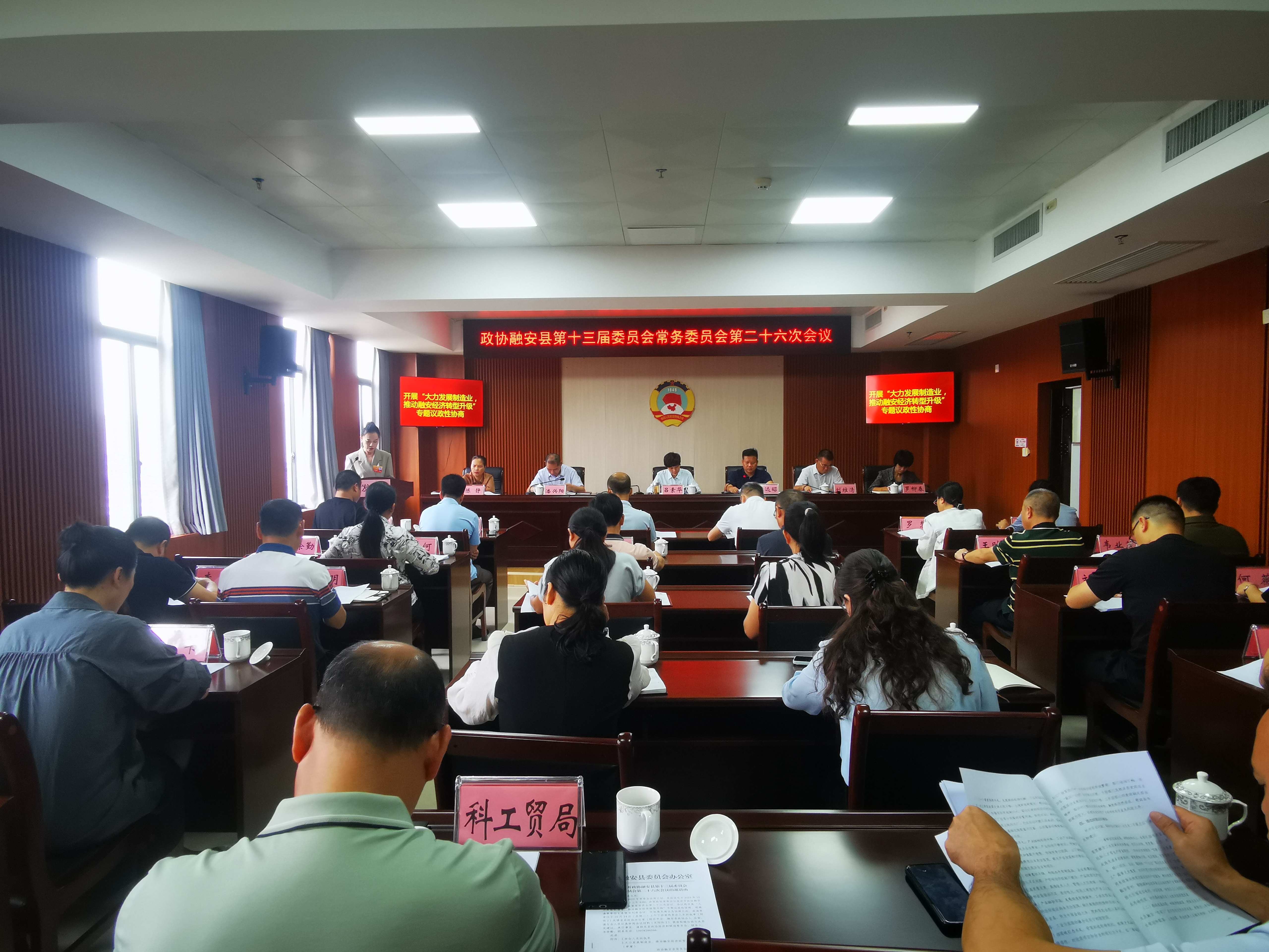 10月15日,政协柳州市融安县第十三届委员会常务委员会第二十六次会议召开,会议传达学习习近平总书记近期重要讲话和重要指示精神,以及自治区党委、柳州市委和融安县委的重要会议精神,听取融安县人民政府关于提案办理情况通报、融安县民政局重点工作情况通报,并围绕“大力发展制造业,推动融安经济转型升级”专题开展议政协商。融安县政协主席吕素华同志表示,学习是人民政协的优良传统,是提升履职能力的根本途径,县政协常委、委员要始终把学习摆在突出位置,提高履职能力及水平;要发挥好政协优势,围绕大力发展制造业既建言又出力,以及围绕民政工作难点重点积极建言献策;要围绕融安县政协十三届五次会议确定的各项目标任务履职尽责,谋划好明年政协全会的大会发言和会议提案、协商计划等工作,推动融安县政协工作提质增效。
