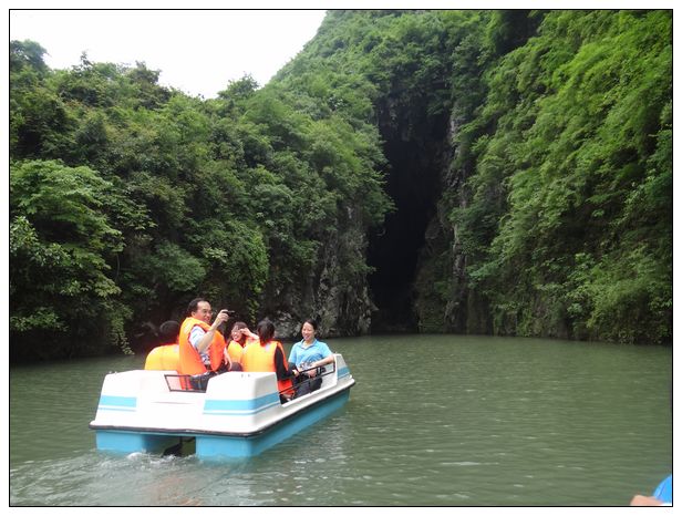 一晃眼十三年过去,旧地重游,昔日的荒野已建设得如城市公园般整洁有序,亭台楼阁错落有致。停车场几乎车满,景区里客来客往。匆匆用过午餐,一行人就急着往核心景区走,我一人轻车路熟,一下子就顺着阶梯下到穴底暗河边,抬头仰望,幽深的地穴雄奇依旧,环顾四周,秀丽的景色既那么熟悉又仿佛很陌生,凉风袭来多了些许亲切。忽然发现,下游岩洞深处闪烁着神秘的彩光,这光一下子就把人吸引过去,伴着潺潺流水来到溶洞大厅深处,流水戛然而止,变成一处开阔的深潭,在彩灯的照射下,水光交相辉映,整个大厅流光溢彩,空气中弥漫着的清凉的雾气把人围住,如同云中漫步,浪漫而虚无。租了条船迫不及待地划到暗河里想探个究竟,但见溶洞里石钟乳、石笋、石柱、石鳗等美不胜收,处处奇景,目不暇接。陶醉中,突然眼前一亮,船竟然漂出了溶洞,来到一处数百平方米的小天池,池水碧绿,绿树成荫,幽深静谧。四围壁立,似无出口,再往外划船,蓦然,一张宽广深邃的大洞口映入眼帘,原来暗河是从此处流出的,好奇心牵扯着你不由自主的往里钻。这是一个较高的岩洞,其形态与前一个溶洞很是不同,如果说前一个溶洞如同美女般婀娜多姿,那么后一个溶洞就像北方汉子般高大粗犷,高大的穹顶下,船和人都显得渺小了。溶洞岸边散落着一些枯木残舟,是否古人之物?十数米高的岩壁上有前人开凿的石级和垒砌的石墙石室,有何用途?思绪迅速穿越时空,引来无尽古思悠悠。船在溶洞里绕行了一个大湾,豁然开朗,眼前是一片波澜不惊的开阔湖面,来到了游船终点,游人如梦初醒,意犹未尽。折回,再穿过后溶洞回到小天池边停靠上岸。虽然是短短一小时的游历,在黑与白的交替中三次穿越溶洞,感觉似乎是跨越了三个美妙绝伦的黑夜白昼,留下如梦似幻的记忆。