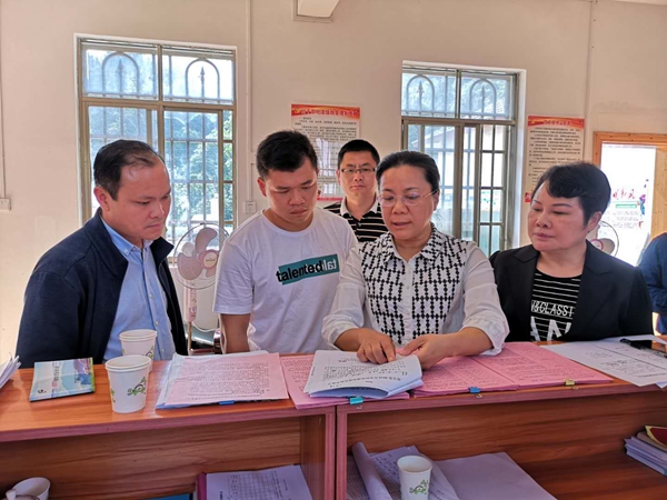 融安县政协主席肖素清(右二)带领县政协机关扶贫帮扶“专责诊疗组”对村级扶贫工作进行现场“诊疗”时的情景
