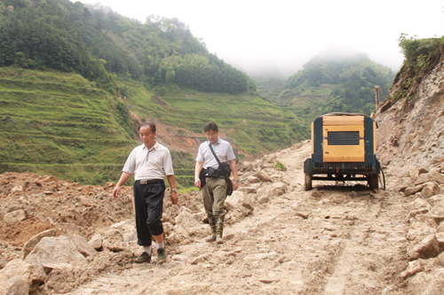 融水县政协主席潘爱国在开展党的群众路线教育实践活动中经常深入基层调研。图为2014年5月22日,潘主席冒雨来到安太乡培秀村视察元宝山景区公路一、二标段进展情况。