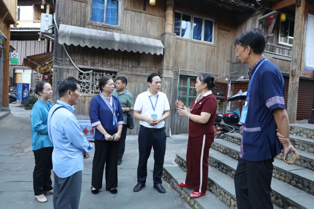 在岩寨百家宴现场,调研组与游客共同体验拦门迎宾、民俗表演等活动,并从音乐、舞蹈、服饰及互动体验等细节,与负责人交流建议,指出要提升民俗表演的原真性与感染力,增强游客的文化体验感。