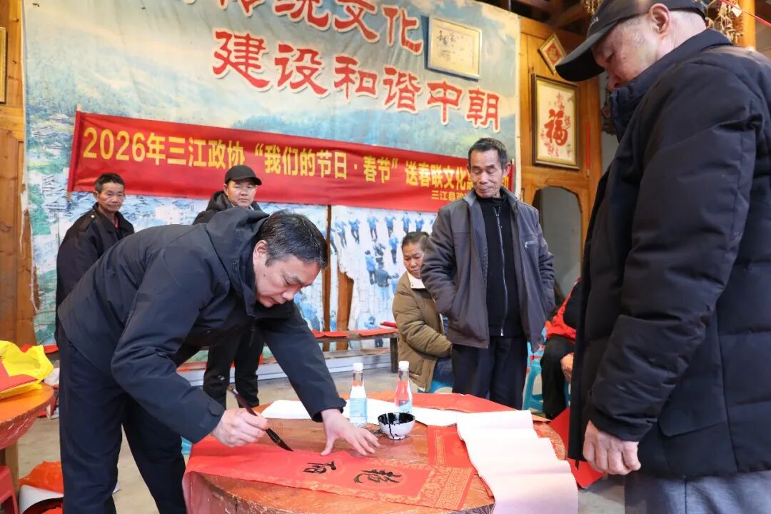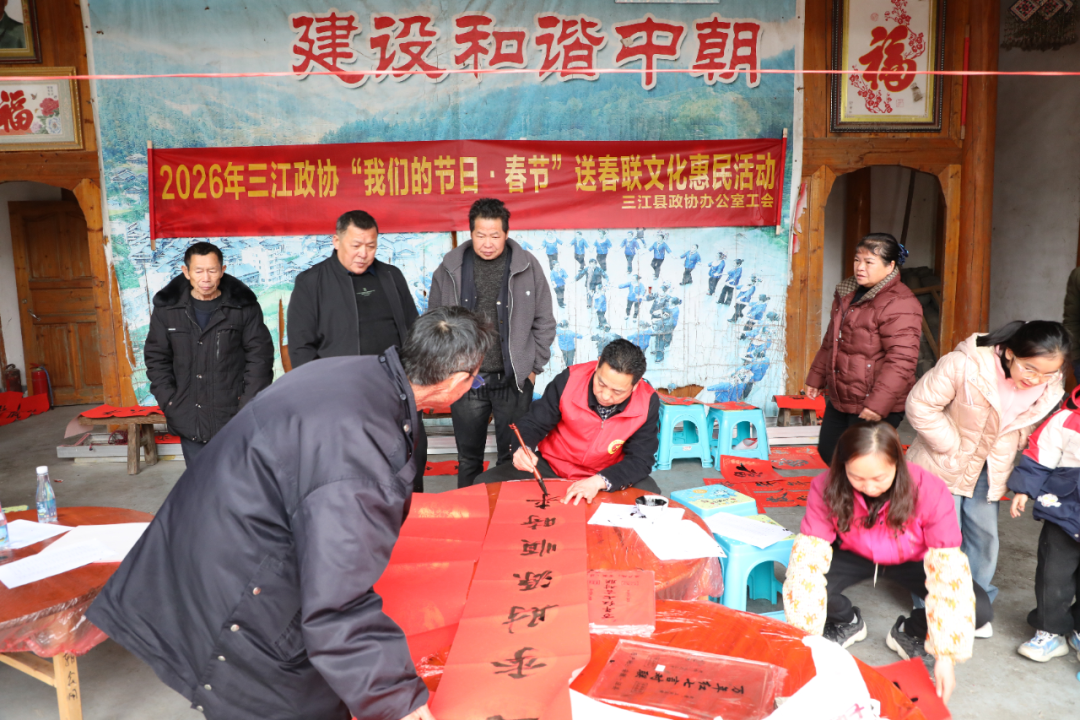 2月10日,县政协组织部分政协委员、书法协会会员及志愿者,赴八江镇中朝屯开展“我们的节日·春节”送春联文化惠民活动,以文化惠民举措传递党和政府的关怀与节日祝福。县政协主席范家荣,副主席韦祖胜、黄惠琳参加活动。