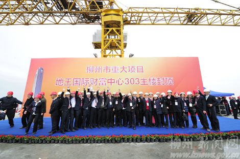 1月12日上午,龙城百姓得到一份高大而厚重的新年礼物:柳州地王国际财富中心303主楼封顶。这座主体高303米的超高层建筑成功封顶,标志着目前广西第一高楼已经诞生,从此,柳州城市发展建设进入了一个新阶段。