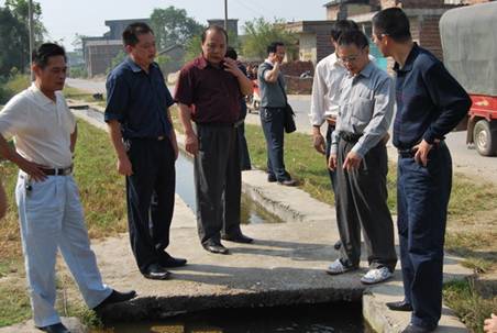 图2:调研组在融安泗维河灌区考察支渠情况(右二为梁樑副主席)